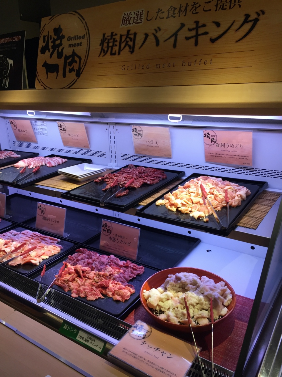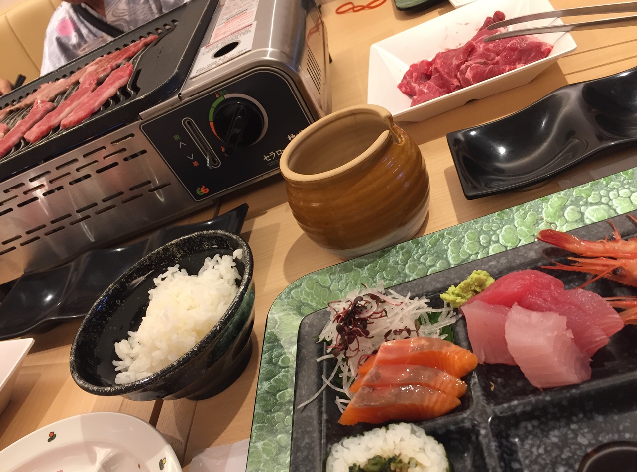 食事は焼肉バイキングがメイン。各テーブルにコンロが置いてあって、熊野牛や壺カルビ、ミスジやてっちゃんなど全て食べ放題です。高齢の両親も問題なく食べることができ、とても喜んでいました。焼肉以外にもお寿司や天ぷら、ご当地食材を使った料理やデザート、アイスクリームやソフトクリームもあり、すごく充実していました。
