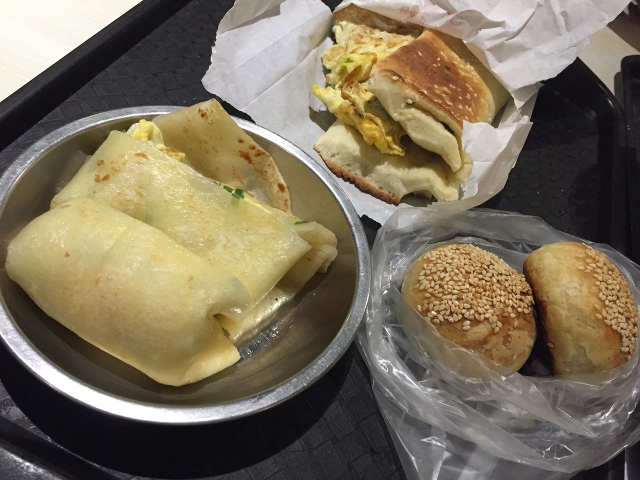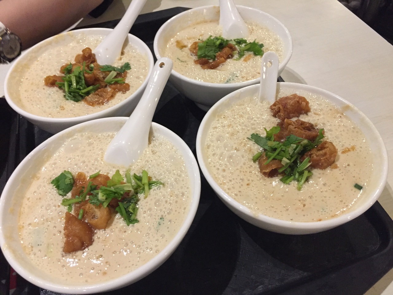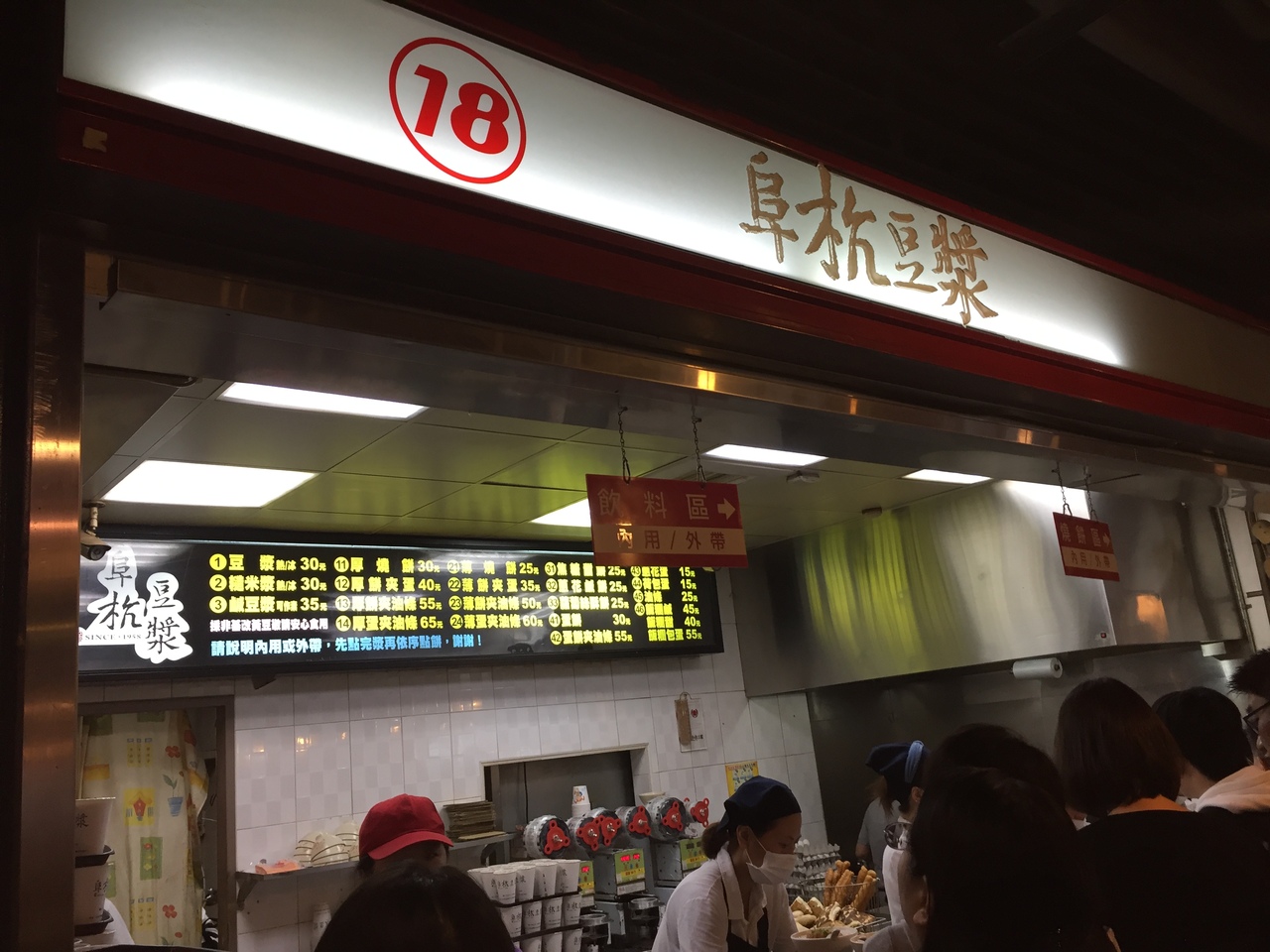 リージェント台北から歩いて20分くらい。MRTでも善導寺駅からすぐです。日曜の朝8時過ぎで30分ほど並びました。2階のフードコート内にあります。混雑しているので注文する人と席を確保する人に分かれました。カウンターでは最初に豆漿、その隣で餅(パン)を注文します。ガイドブックを見せて指差しで注文しました。鹹豆漿は、出汁の効いたおぼろどうふに揚げパンとパクチートッピングで優しいお味がとっても美味しかったです。蛋餅(卵焼き入りのクレープ)、厚餅夾蛋(卵焼き入りのパン)、蔥花鹹餅(ネギ入りの丸いパン)どれも美味しくて、人気の理由がよく分かりました。