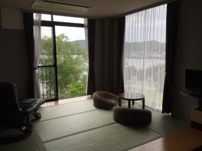 美味しいイタリアンを提供するオーベルジュタイプのホテルです。夏はウニのジュレやウニのパスタがついたコースがあり、地元野菜や自家製パン、自家製生パスタなど、どの料理もとても美味しくて絶品でした。離湖に面した和洋室はとても眺めが良く明るいです。スパのお湯は夕日ヶ浦温泉から運んでくるそうです。ワンコは館内には入ることができませんが、冷暖房完備のドックハウスがあり、広い芝生のドッグランもありました。