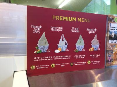 沖縄の素材を使ったものや、賞をとったメニュー(プレミアムメニューとして100円アップ)があります。イタリアで世界一の賞をもらったのはパイナップル・セロリ・リンゴのソルベでしたが頼み忘れて、同じくプレミアムメニューのオレンジバニラマスカルポーネ、グランピスタチオ、今帰仁スイカのトリプルを注文しました。悩んでいた伊江島産紅芋をワンスクープつけてくれました。