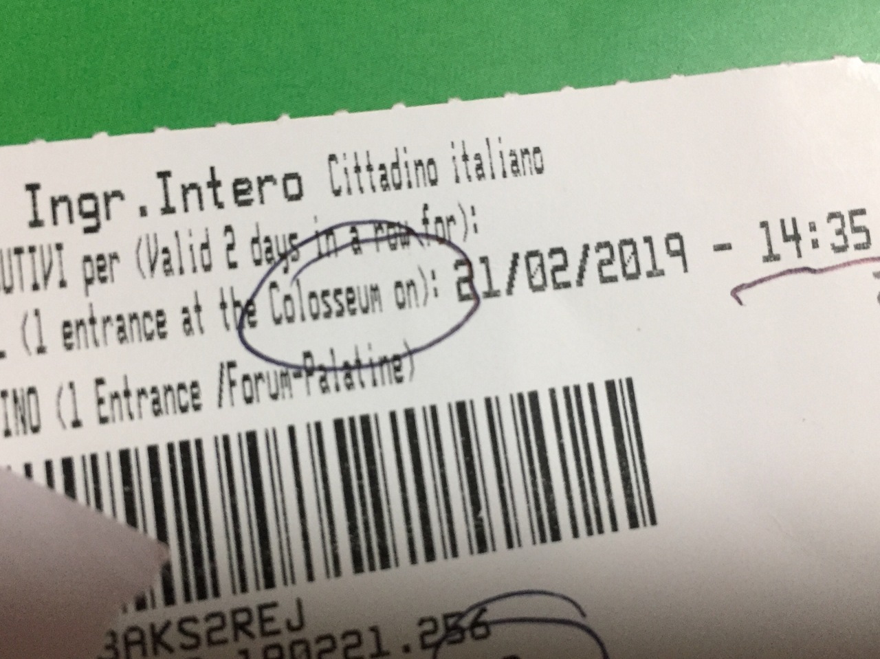 ツアーでは車窓観光のみだったので、翌日のフリータイムに再訪しました。入場チケットはフォロロマーノのチケットと共通で、フォロロマーノのチケット売り場の方が空いていると聞いていたので、そのようにしました。実際2組待っただけで購入できました。先にコロッセオに行くのかと聞かれ、そうだと答えたら、20分後くらいの時間指定のチケットを渡されました。添乗員さんによるとつい最近時間指定チケットになったみたいです。