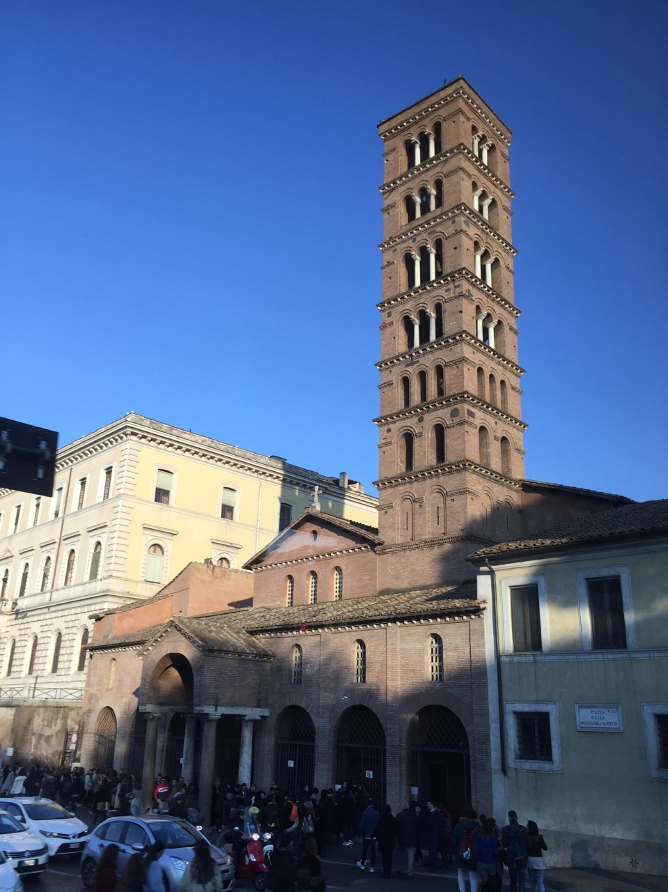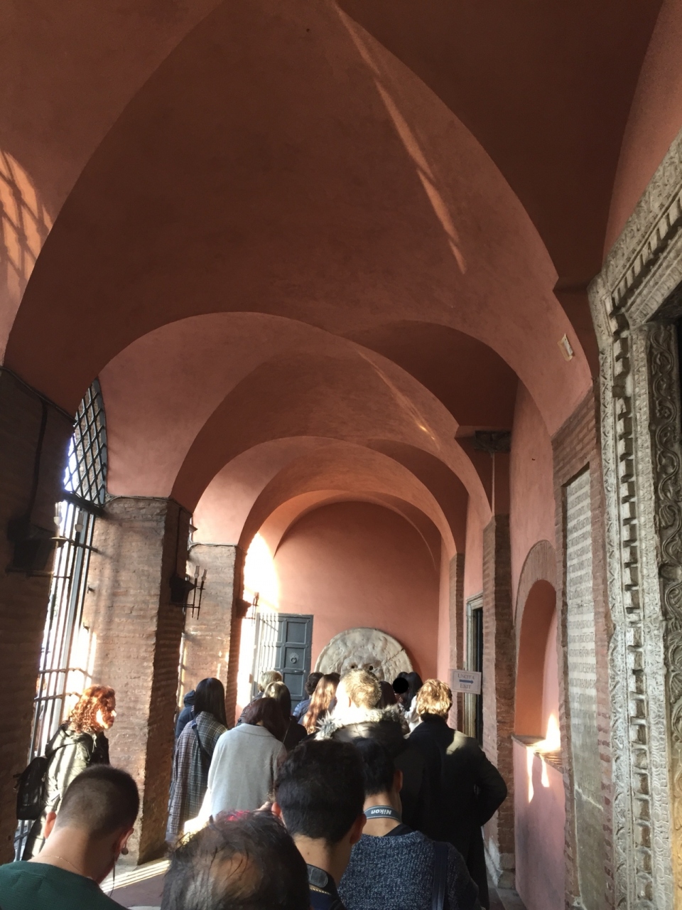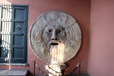 教会入り口にある大きな顔のレリーフ、真実の口は、ローマの休日のロケが行われた場所。嘘つきが手を入れると抜けなくなるという伝説を信じたアン王女が、新聞記者のジョーの手が抜けなくなった演技に騙されて絶叫するシーンは、あまりに可愛くて印象的。レリーフと一緒に写真を撮りたい人の列は教会の外まで続いており、30分ほど並びました。写真を撮り終わると教会の中に誘導されます。静かでおごそかな雰囲気でした。お土産やさん?もありました。
