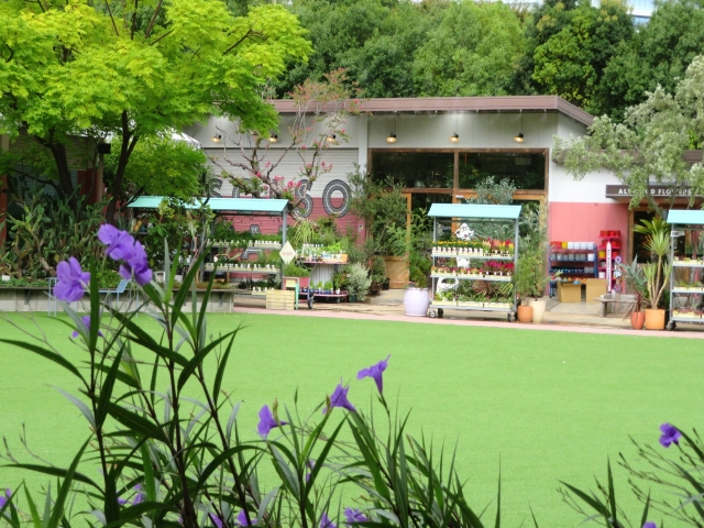 2018年にオープンした新しいパークライフスタイルを提案する施設です。植栽はリゾート地のようで、ここには「SOLOS PARK 」があり、観葉植物や多肉植物など、大きなものから小さなものまで多くの品種が売られています。大きなパーゴラの下には、たくさんのテーブルと椅子が置かれていて、緑の中で寛ぐには格好のスペースとなってます。室内で寛げるカフェもあります。緑一杯なのに芝生は人工芝でした。