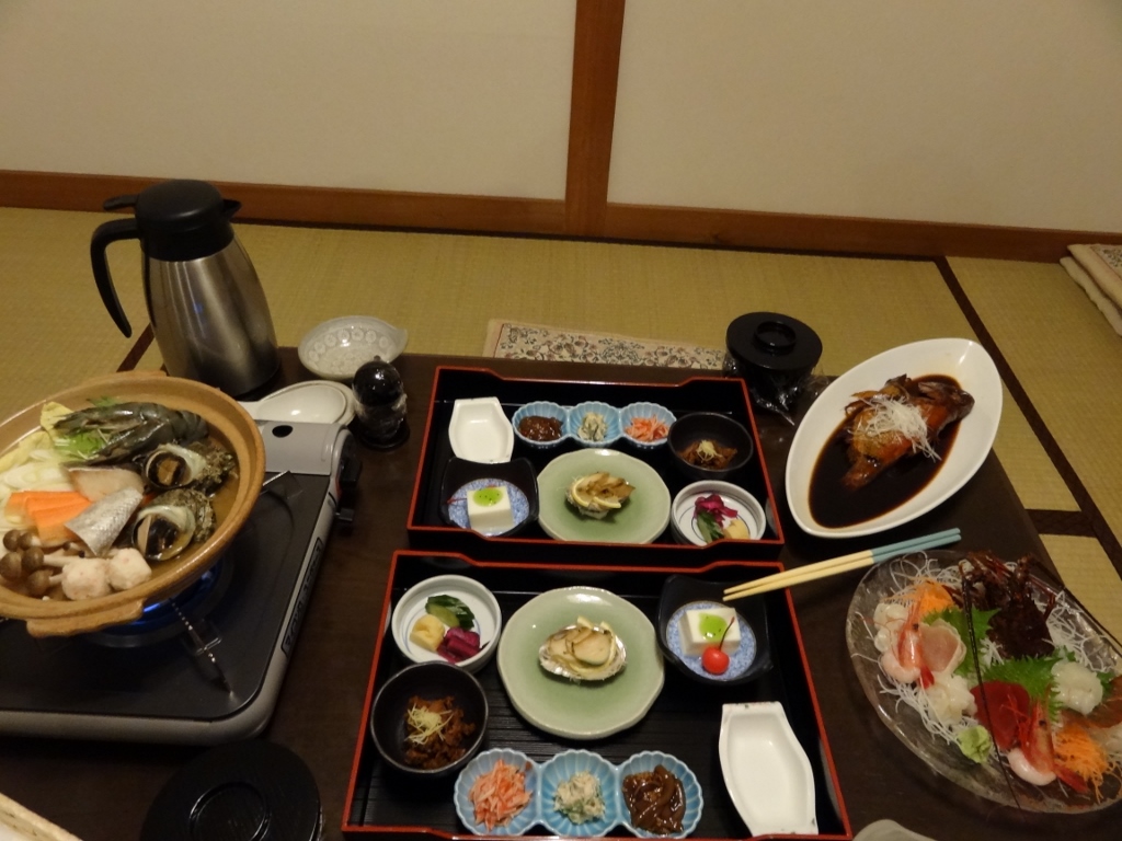 食事はお部屋でいただきましたが、内容は文句なく量も味付けも大満足でした。特に楽しみにしていた金目鯛を刺身、蒸し、煮魚と様々な料理でいただくことができました。朝の金目鯛の味噌汁の無料サービスも優しい味でとても良かったです。