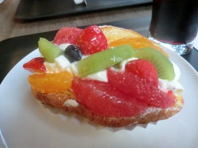 オムレットの上にたっぷりのフルーツ、生クリーム、あんこがのっています。見た目も美しいながら、