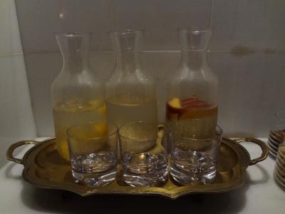 レストルームには冷たいフルーツウォーターやナッツが置いてあったり、