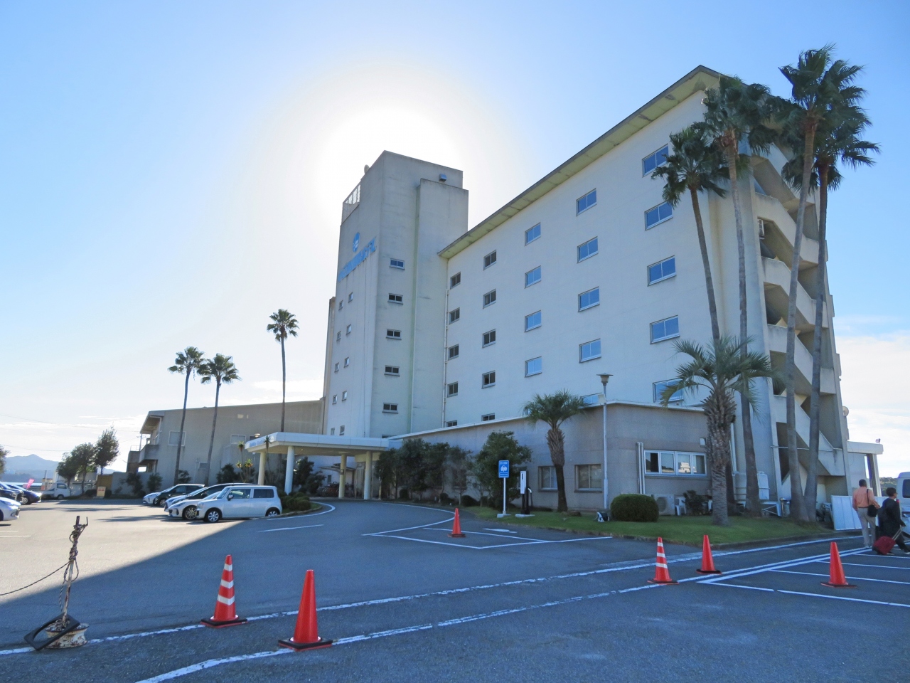 JR南紀白浜駅からバスで15分ほど、白浜BSバス停のすぐ横に建つホテルです。