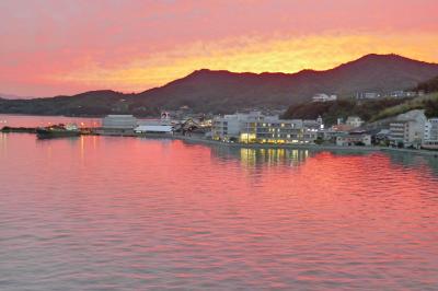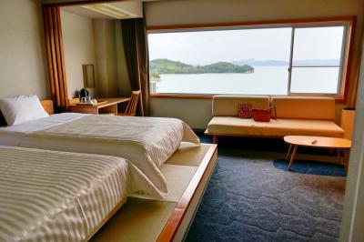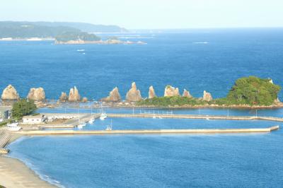 部屋からは橋杭岩が一望できる。夕食(ビュッフェ)も品数多くデザートも美味しいし