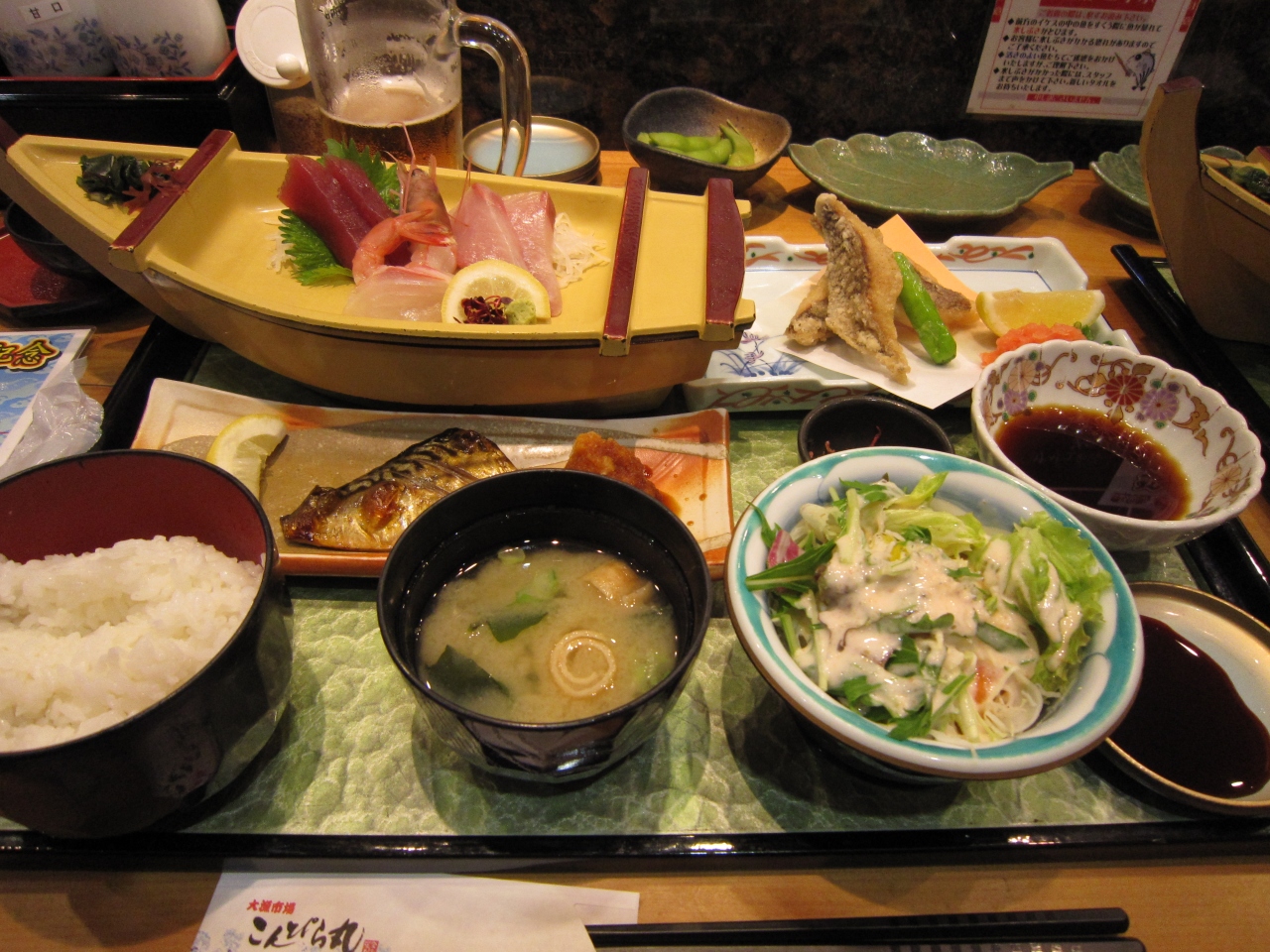 シングルルームの2人利用で、なんと1泊2食付き、2人で9,000円の格安でした。が、夕食の豪華さにびっくり! 夕食は併設の海鮮居酒屋で海の幸の定食。刺身、サラダ、焼物、揚げ物、ご飯、味噌汁、小鉢・・・ 等々がついた豪華版でした。朝食にもカツオのタタキ等があって美味しかった♪