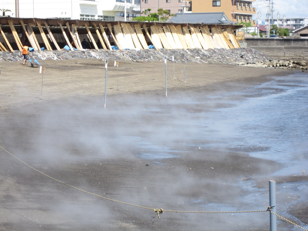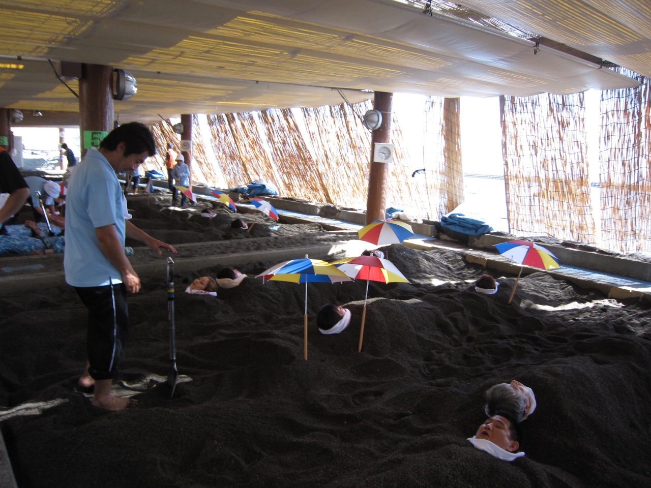 受付で浴衣を借り、更衣室で浴衣に着替えて浜辺の砂風呂へ。タオルを顔に巻いて、オバチャンに砂をかけてもらうと・・・・ 思ったより熱い!こらえつつしばらくじっとしていると・・・ドバっと汗が出てきました。いい気分。すぐに熱さに慣れて、空を眺め、波の音と全身の血流を感じながら過ごした10分間。とても幸せな気分を満喫することができました。