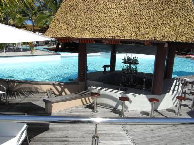 ホテルのプールです。プールサイドでは、サマーベッドで日焼けしている人や...