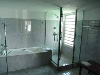 ここがバスルーム。ガラス張りのシャワー室。ちょっと水はけは悪いですが、...