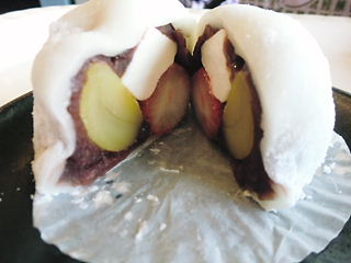 「なんじゃこら大福」って、ほんとに何?!って感じですが、大きいあんこ饅頭にクリームチーズ、いちご、栗が入っています。