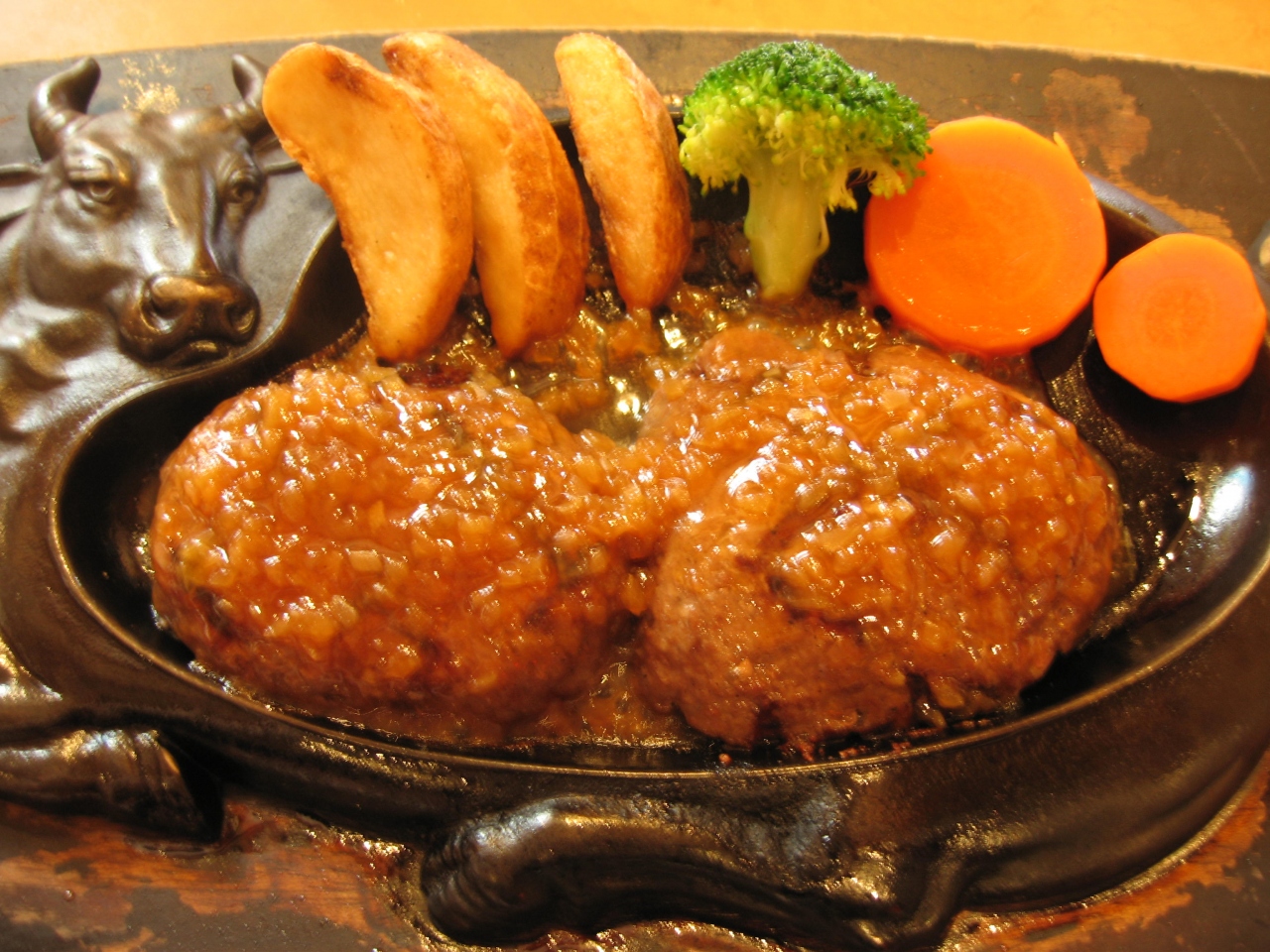 炭火焼の牛肉100%のハンバーグが人気の店で、2種類から選べるソース(デミグラスかオニオン)をかけて食べます。
