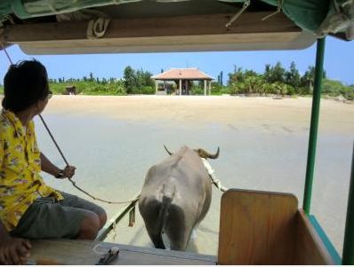 沖縄の代表的な風景として利用されることも多い、西表島から対岸にある島まで、水牛車に乗って海を渡る場所です。とても風光明媚な場所ですが、できれば潮の時間を見て訪れてほしい場所です。