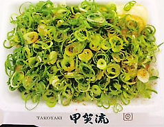 たこ焼きのうえには、たっぷりのねぎとマヨネーズがかかっており、お好みで一味をかけます。