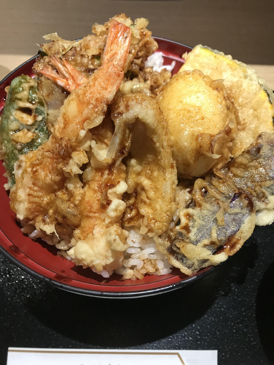 とても具沢山の天丼で、天ぷらもカリっとあがっていましたが、タレと天ぷらとご飯の絡みがあまりよくなく、天ぷら定食の方が良かったかもと思いました。
