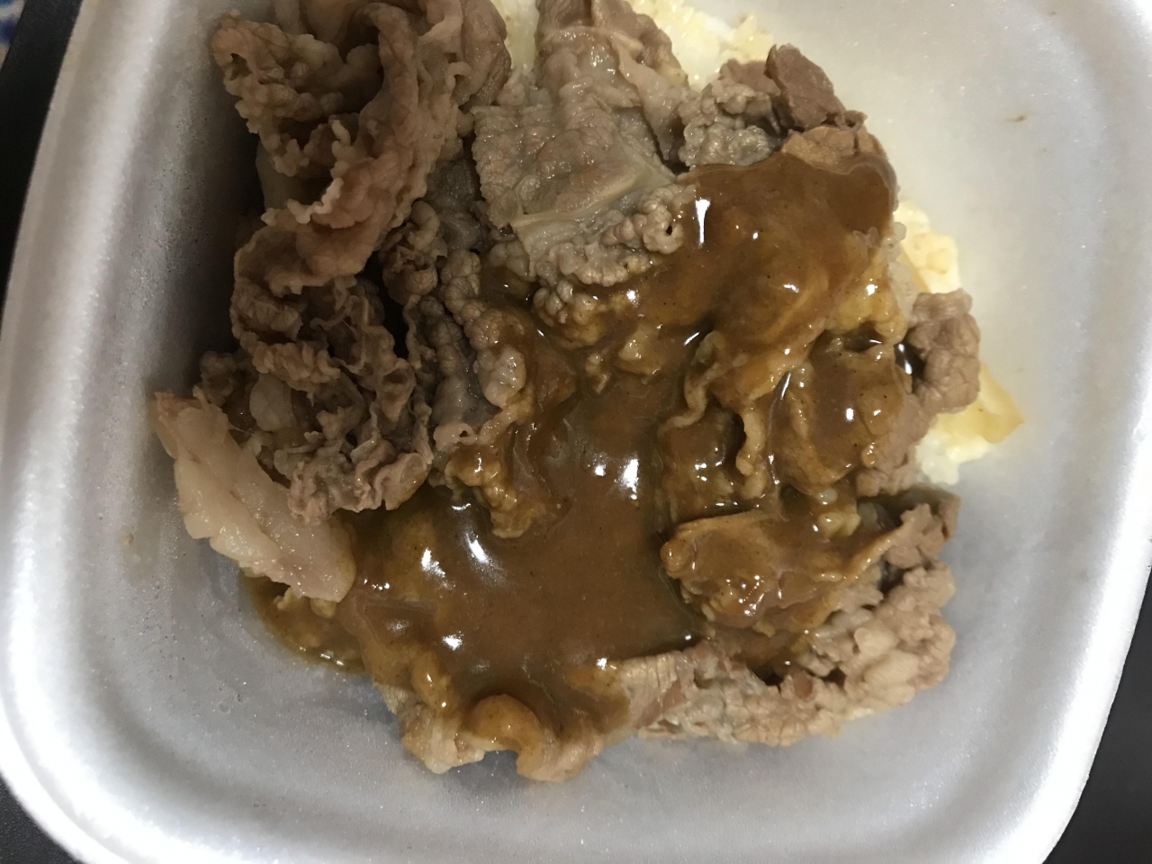 カレーライスのトッピングに、牛丼のあまたがのっている感じです。