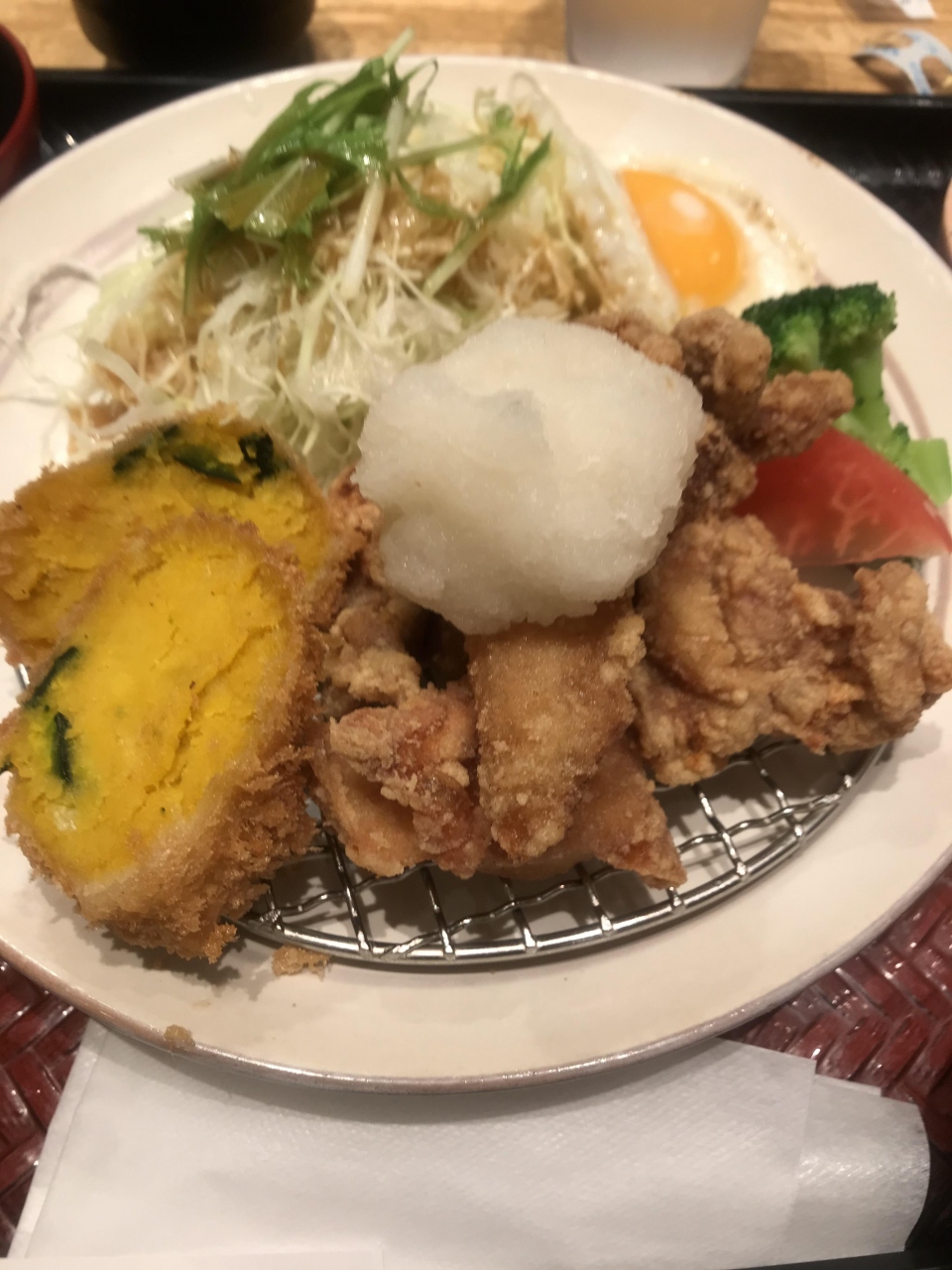 鶏のから揚げに、カボチャコロッケと目玉焼きがメインです。