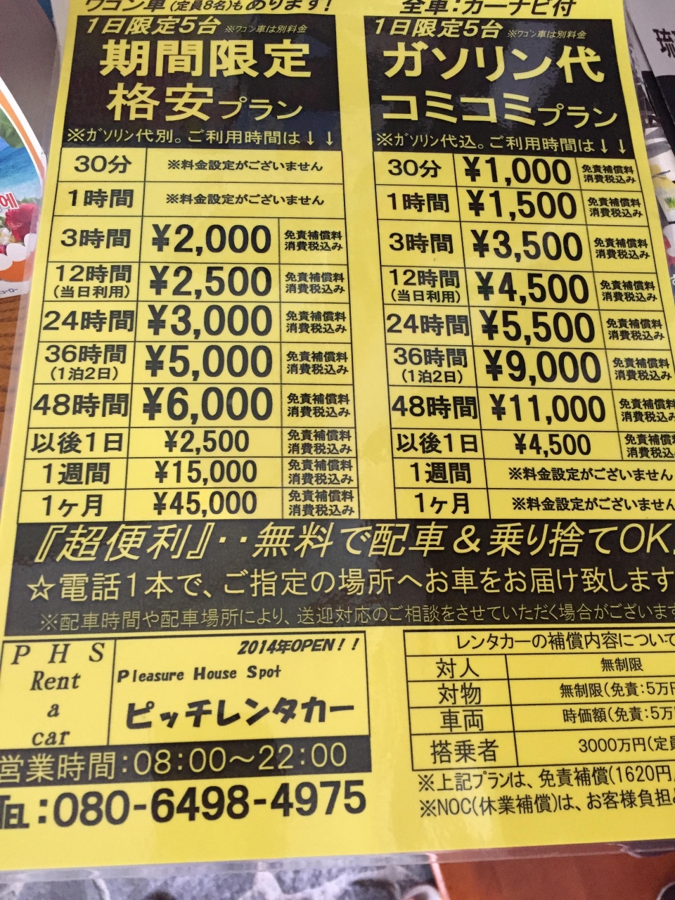 石垣の相場は、1日3,000円~3,500円ですが、会社によって車のレベルがかわる気がします。