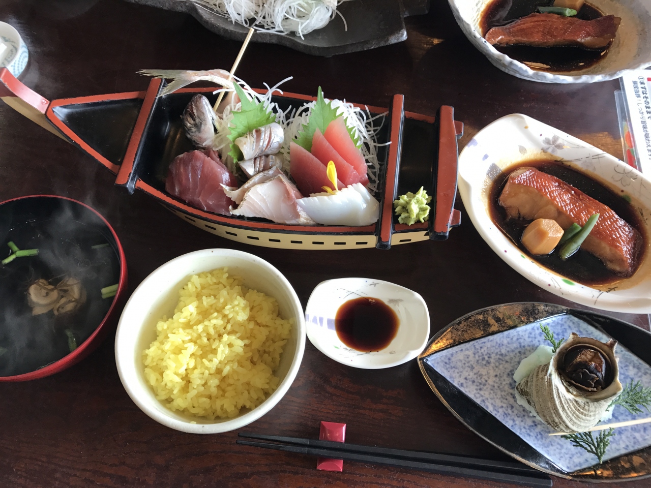 お刺身盛りにサザエ、金目の煮つけと盛りだくさんのセットです。