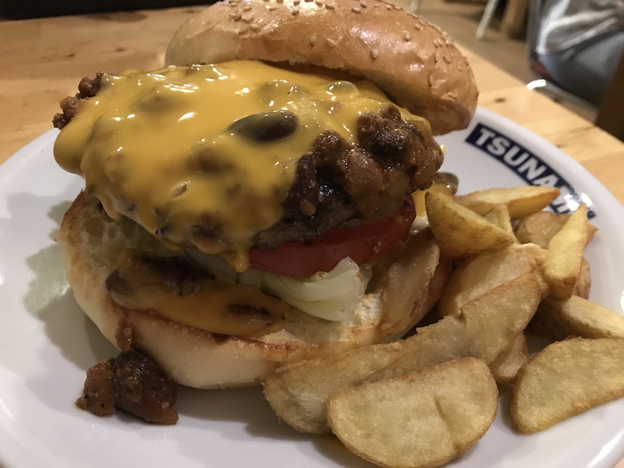 チリコンカンのソースはハンバーグにも、バンズにも、ポテトにもピッタリ。