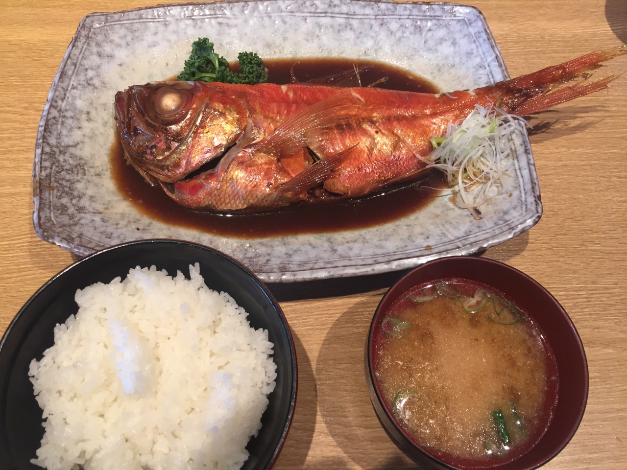 金目鯛丸ごと一匹使った煮付に、ご飯とみそ汁がついて2,000円と割安でした。