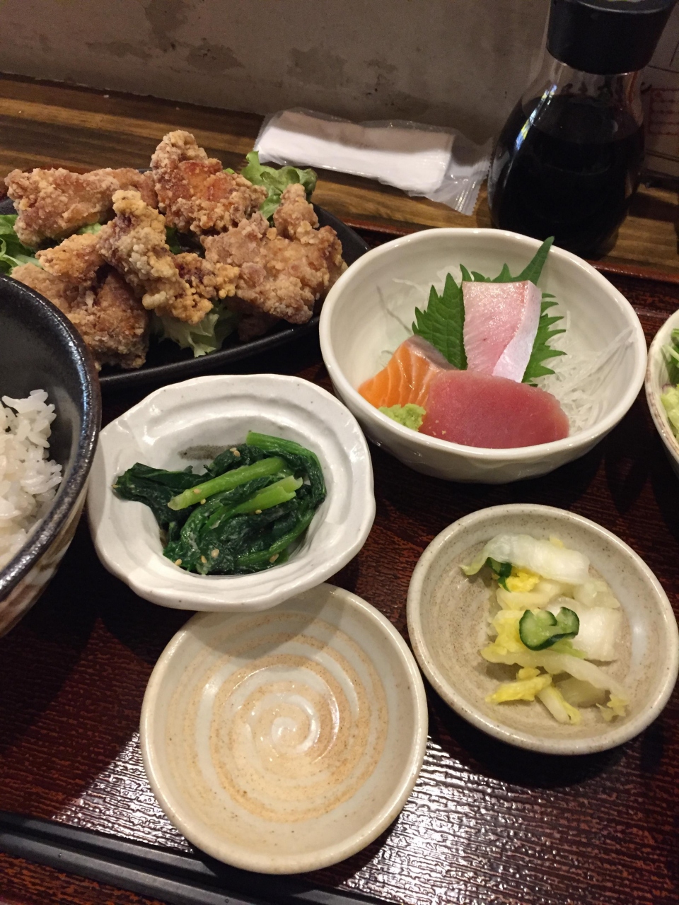 日替わりのから揚げランチにしましたが、一口では食べきれないから揚げが5・6個に、3種が1切れづつのミニサイズお刺身、サラダにあら汁のみそ汁がついて780円でした。