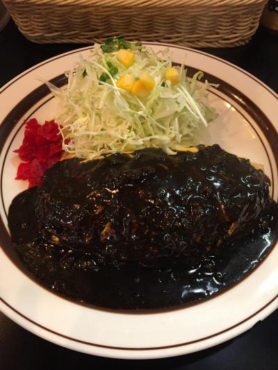 軽めのドライカレーのご飯をたまごでくるみ、黒いカレーがかかっています。