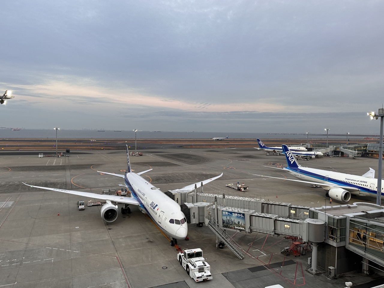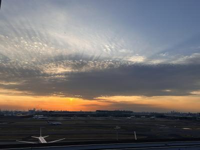 とても大きなガラス窓の向こうは、滑走路と東京湾、景色はスカイツリーや東京ゲートブリッジにディズニーランドなど、ダイナミックな景色が見られます。