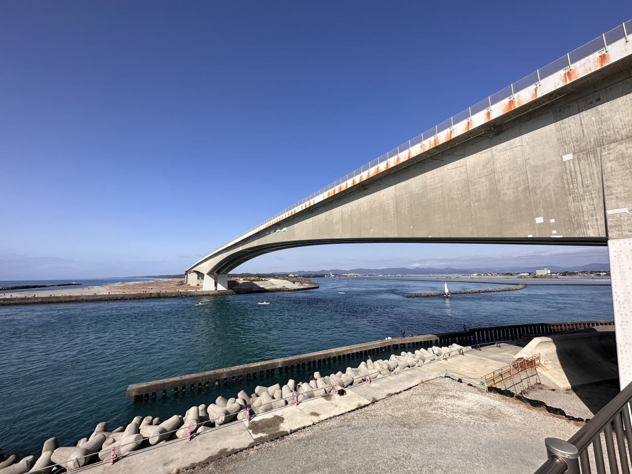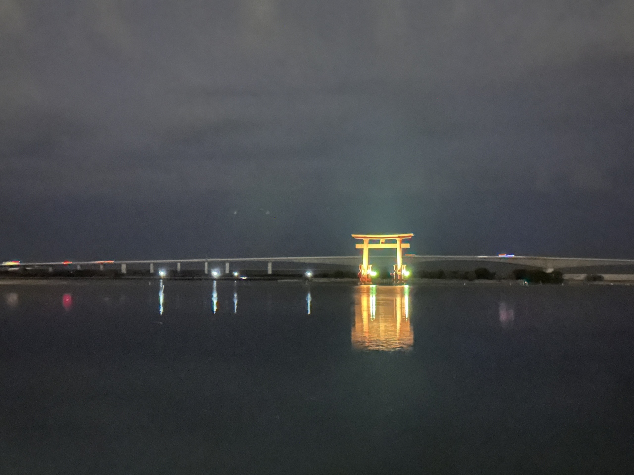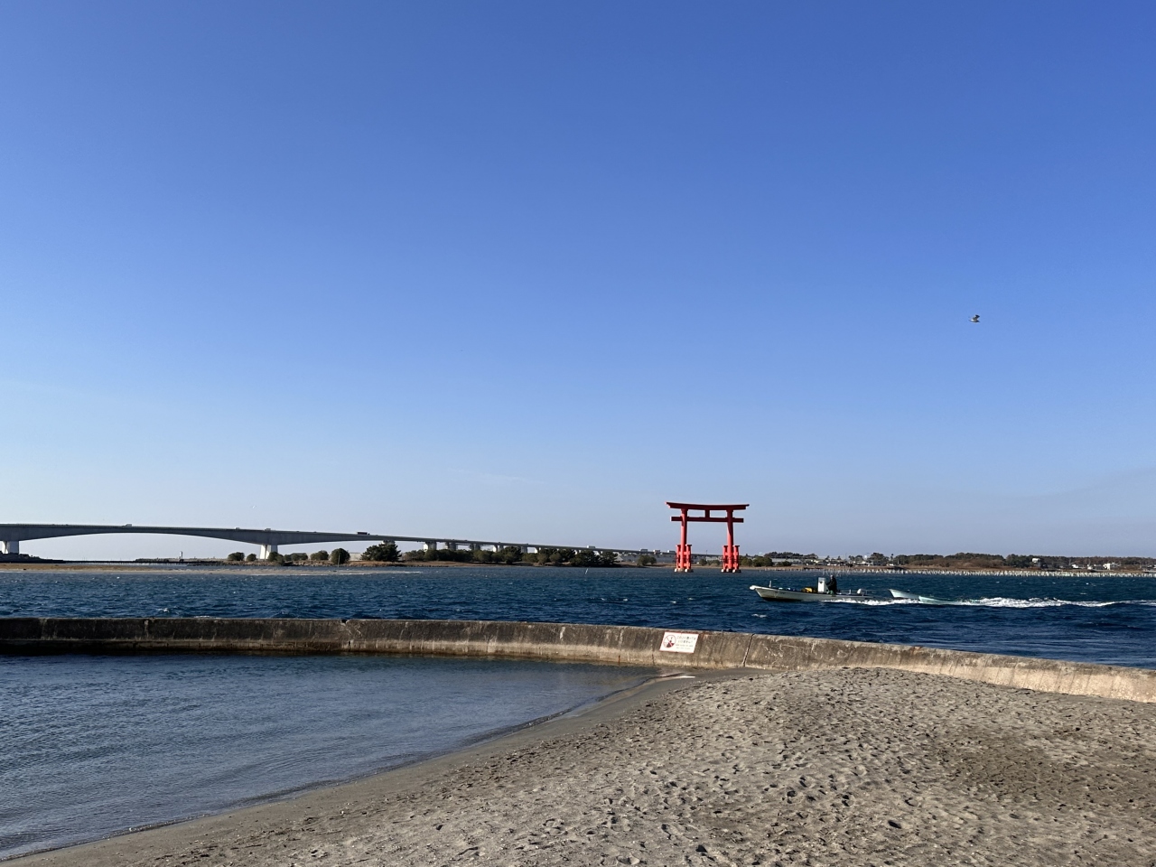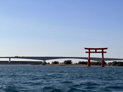 浜名湖上に浮かぶ赤い鳥居のようなものは、バックに浜名湖大橋があり、とても風光明媚な場所です。