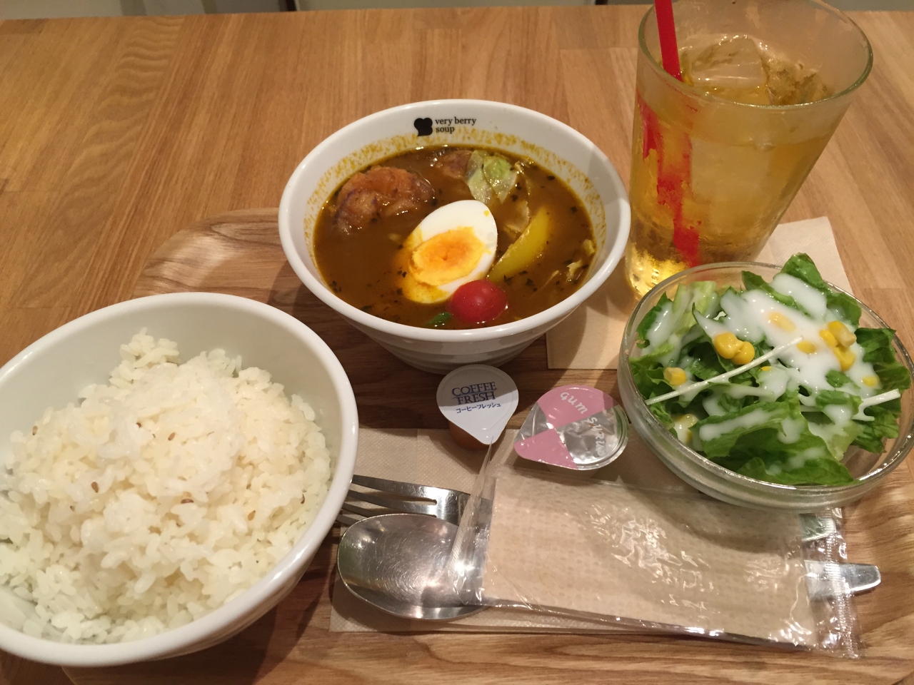 クーポンサイトで、スープ+サラダ+ご飯+ドリンクセットの500円クーポンがあったので、購入していきました。