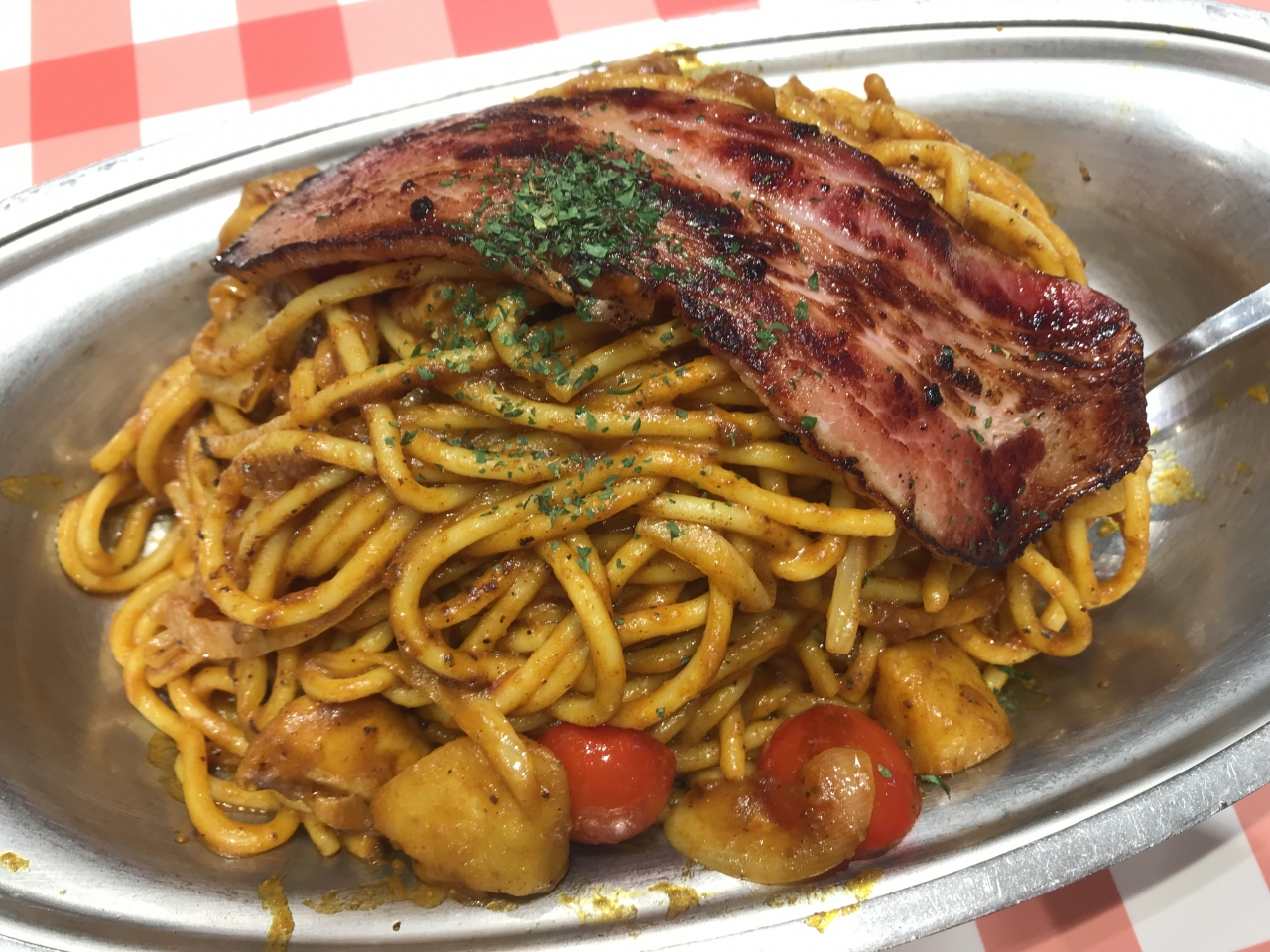 このお店では、ナポリタンとミートソースしか食べたことがなかったので、季節限定のゴロっとチキンのカレーナポをいただきました。