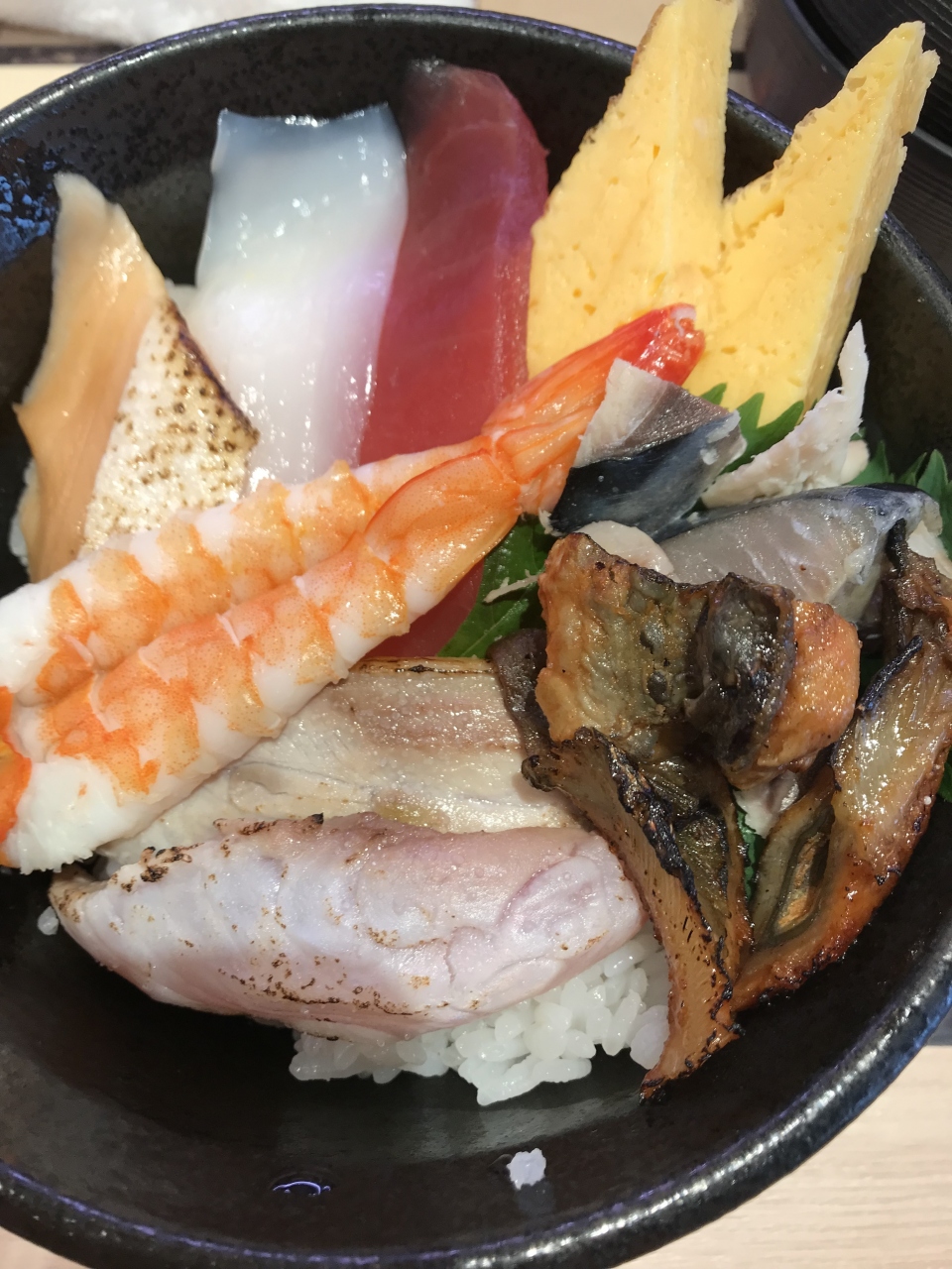 江戸前天丼をオーダーしたところ、大きなアナゴの天ぷらに、海老2本、野菜、かき揚げともりだくさんでした。