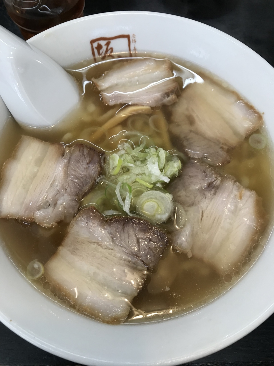 チャーシューも4枚のってボリュームもあり、ランチタイムは半ライスとお漬物が無料でつきました。