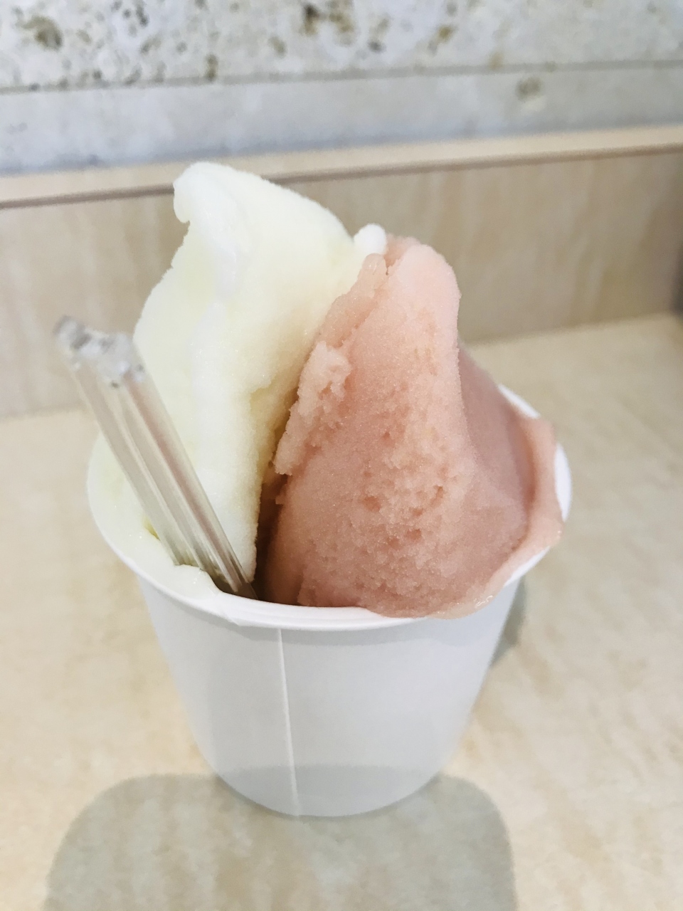 牧場を経営しているようで、ミルクを使ったアイスを選ぶべきですが、さっぱりしたい気分だったので、グアバとパイナップルにしました。