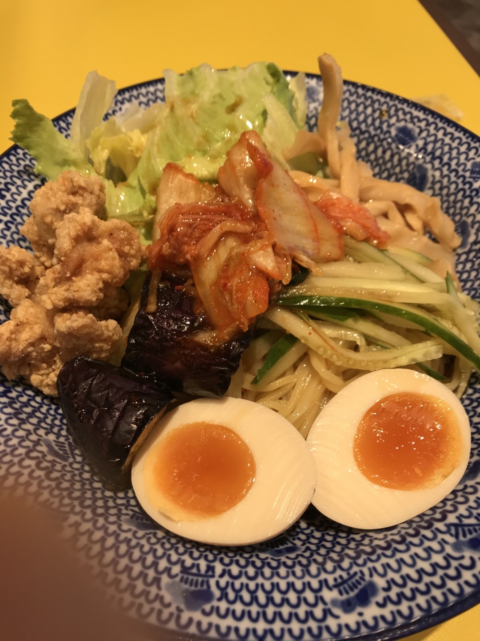 野菜に唐揚げとキムチがトッピングされていて、非常に酸味が効いたサッパリ麺。