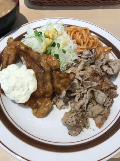 今回は、チキン南蛮にからし焼肉がついた880円の定食は、他にサラダとナポリタンとみそ汁がついてきて、ボリュームたっぷりです。