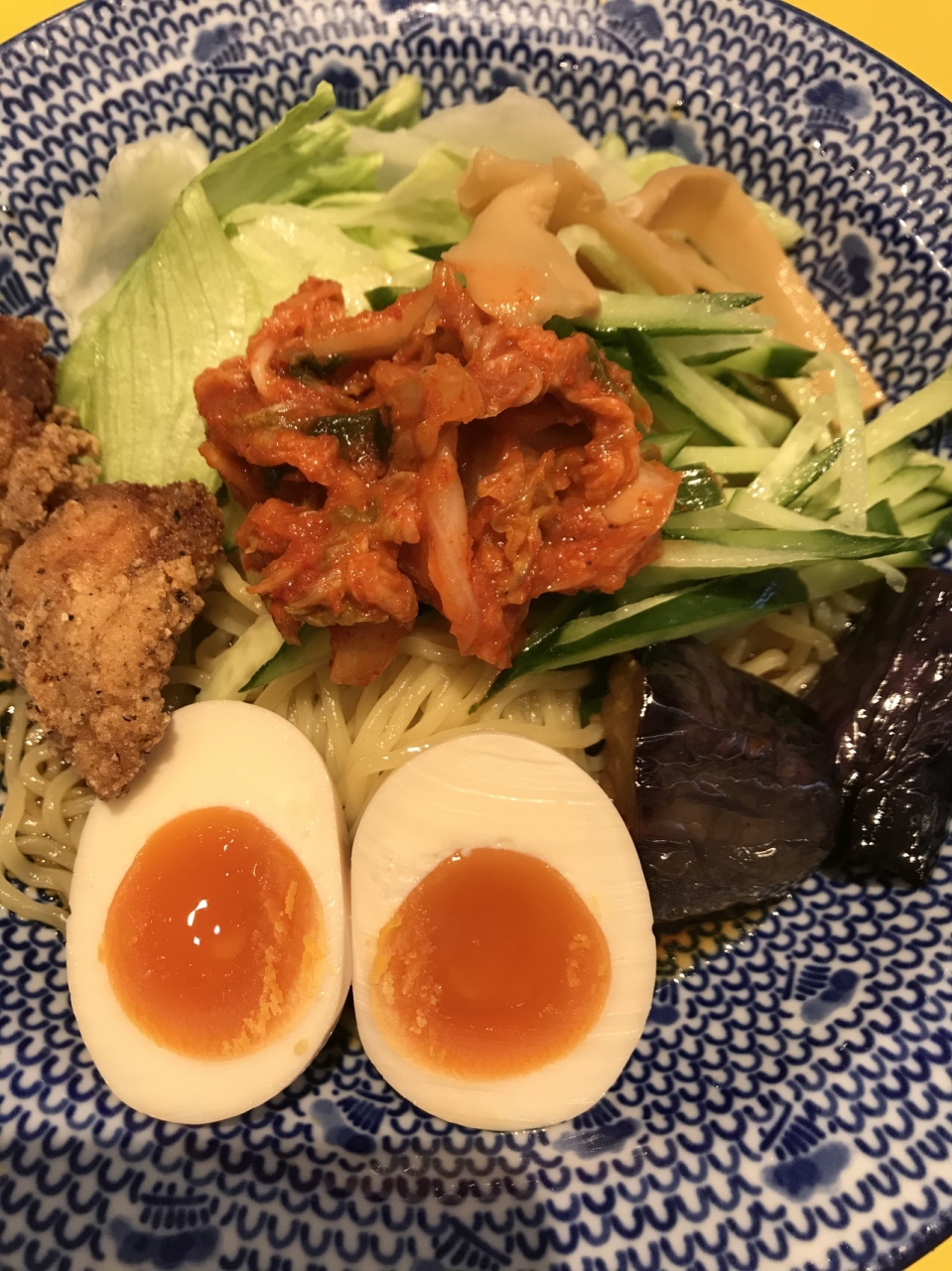 今年は、サラダ冷やし中華ということで、煮卵・メンマ・レタス・きゅうり・とりのから揚げがトッピングされており、たれも酸味がたっぷり効いて美味しかったです。