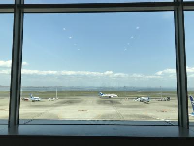 とても大きな窓があり、その先に滑走路、東京湾、東京の街並みが見渡せるうえ、カフェもあってとてものんびりできるスペースになっています。