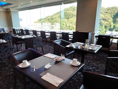 松山の中心 大街道交差点至近にあるANA系列のホテル 朝食会場となる最上階バースカイラウンジのカウンター席からは松山城がわずかに見えます 朝食会場は少し遅めの8時前に入店すると ゆっくりできました デザートのケーキはおいしくすぐに品切れになるので早めにとることをお勧めします