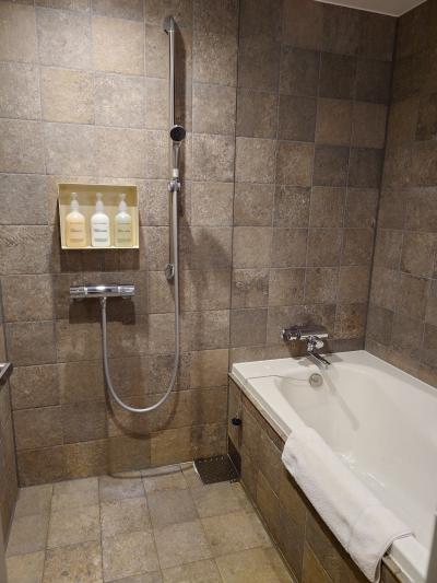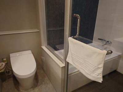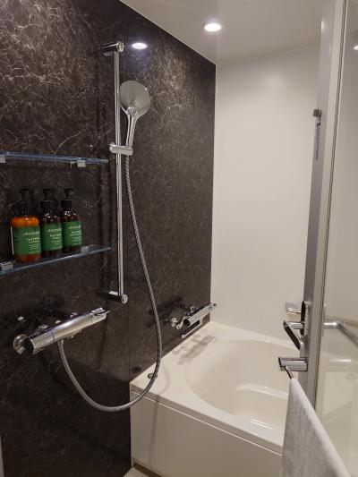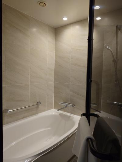 ホテルから高架を走る電車が見えるほど、博多駅から近いホテルです。今回はクラブフロアを利用しました。クラブフロアのルームキーは木製です。また、今回利用した部屋のバスルームは洗い場があるタイプでゆっくりくつろぐことができました。