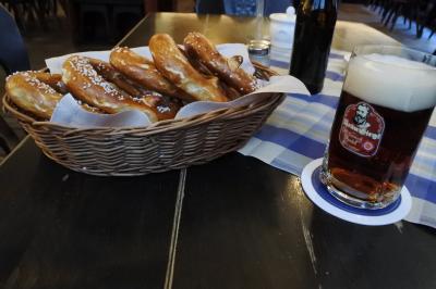 朝8時からの営業です。朝からビールなんて思うかもしれませんが、午前中限定の白ソーセージには、小麦ビールとブレーツェル。なお、テーブルの上のブレーツェルは有料です。お支払いの時にいくつ食べたか確認されますので、ご注意を。