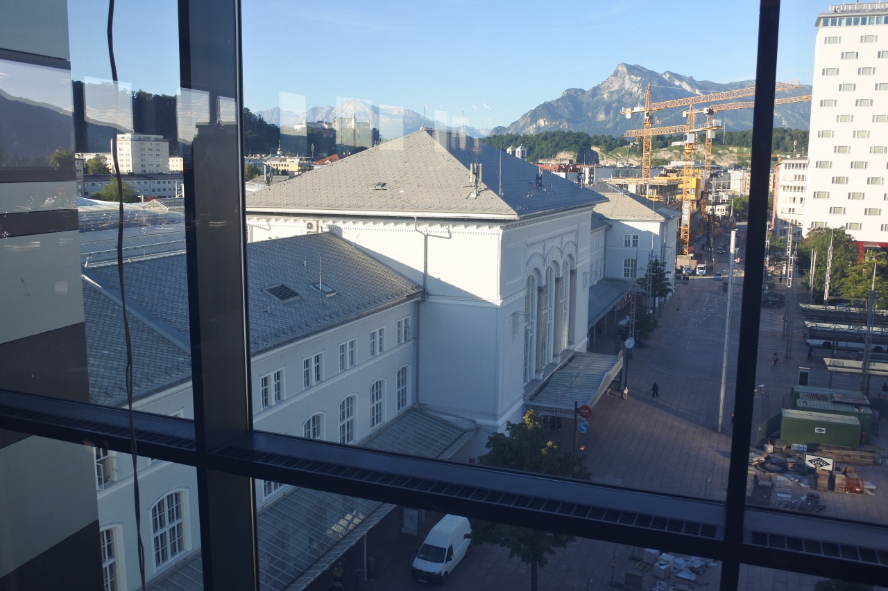 中央駅際にあるガラス張りのホテルです。目立つので迷うことはありません。また、最上階にある朝食会場からはザルツブルクのを囲む雄大な山々を眺めることができます。中央駅の駅舎越しにランドマークであるホーエンザルツブルク城塞までも見ることができます。カードキーがないと、エレベータでどの階にも行けないのでセキュリティも安心です。