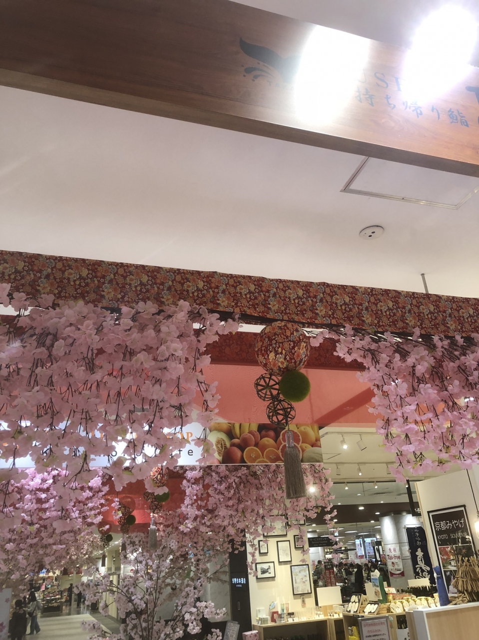京都駅前八条口から5ー6分くらいのところにあるイオンモールです。スーパーやドラッグストアなどが入っています。スーパーはお惣菜やお弁当も売っているので、ホテルでゆっくりしたいときにお弁当をここで買えるので便利です。店内は春のイメージでデコレーションされていますよ。