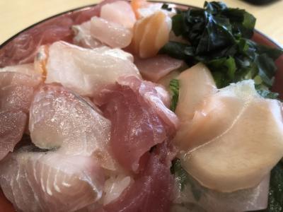 メニューは、海鮮丼。ご飯の大盛りは無料です!手がるにすぐ入れました。- 旅行時期
