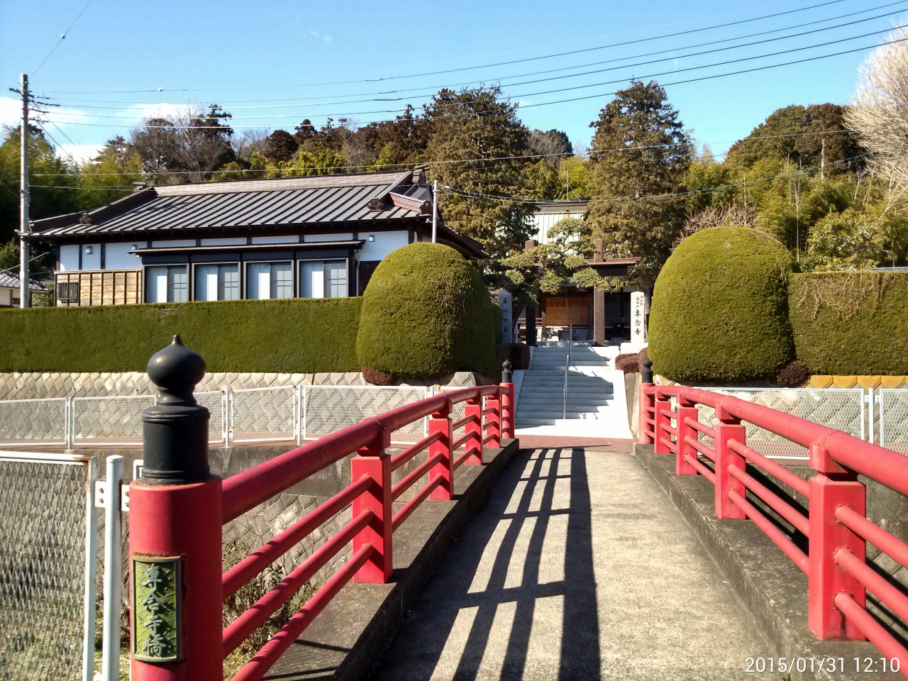 このお寺は鎌倉時代から目の前の川で負傷した武将が、目を洗ったら、治ったという言い伝えのあるお寺で、深谷目薬師」と呼ばれる薬師如来があり、目の病気に聞くといわれています。また境内に通じる赤い橋が特徴のお寺でもあります。