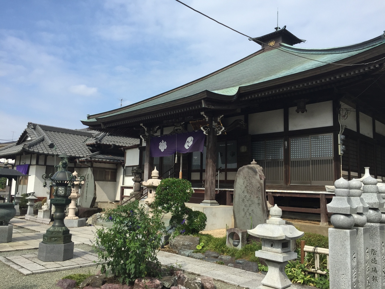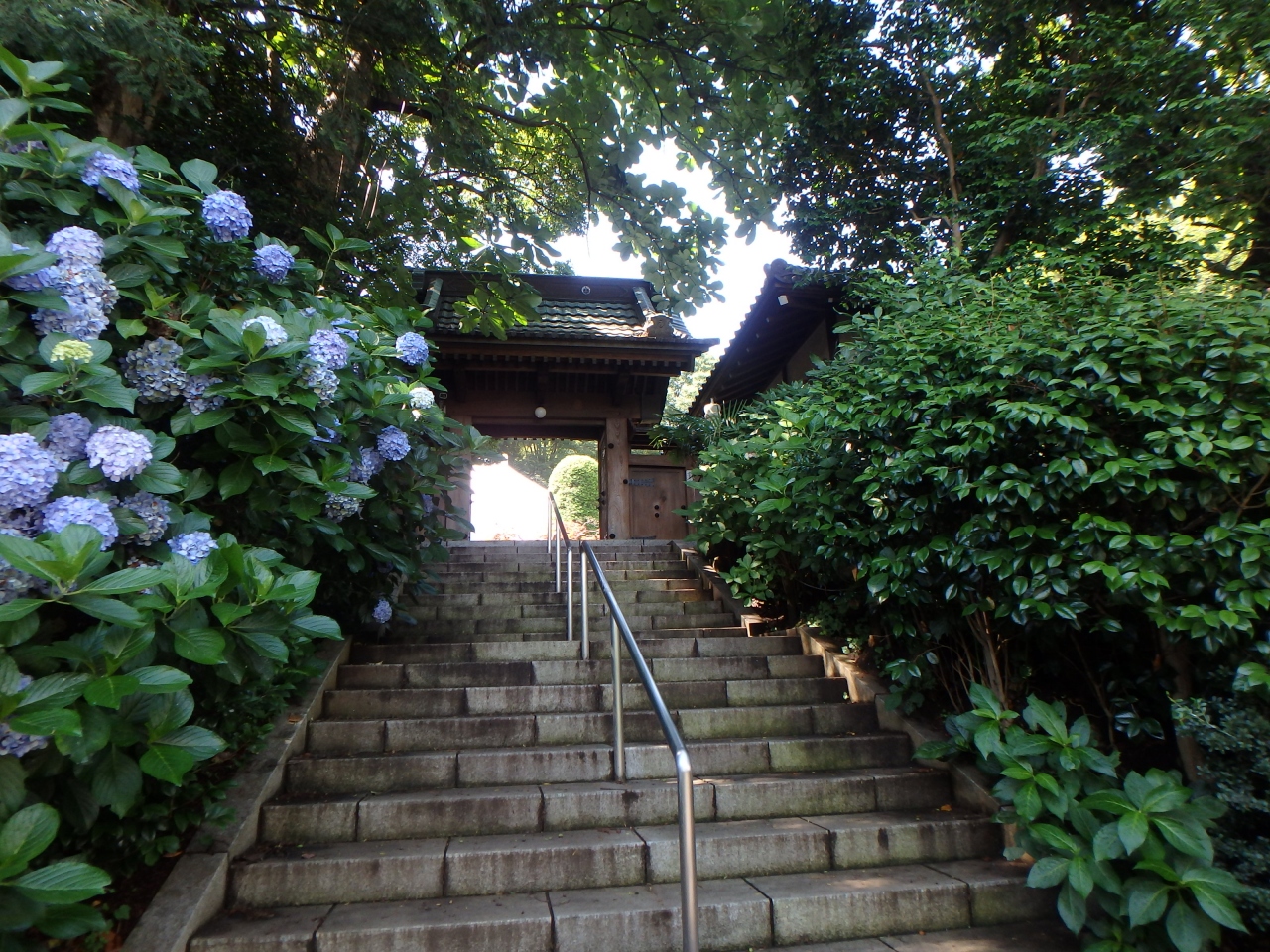 川から少し丘に上がったところにあるお寺です。入口は20段くらいの階段になっていて、その奥に境内、本堂があります。木々に囲まれているので非常に緑が生えるお寺で、雨が上がったすぐ後に行ったので、なおさら水滴がいい感じでコントラストになっていました。非常に物静かなお寺です。