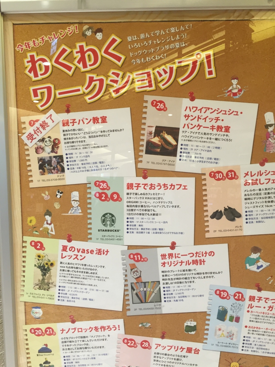 今年も二子玉川駅前のドッグウッドプラザでは、子供向けのさまざまなワークショップやってます。