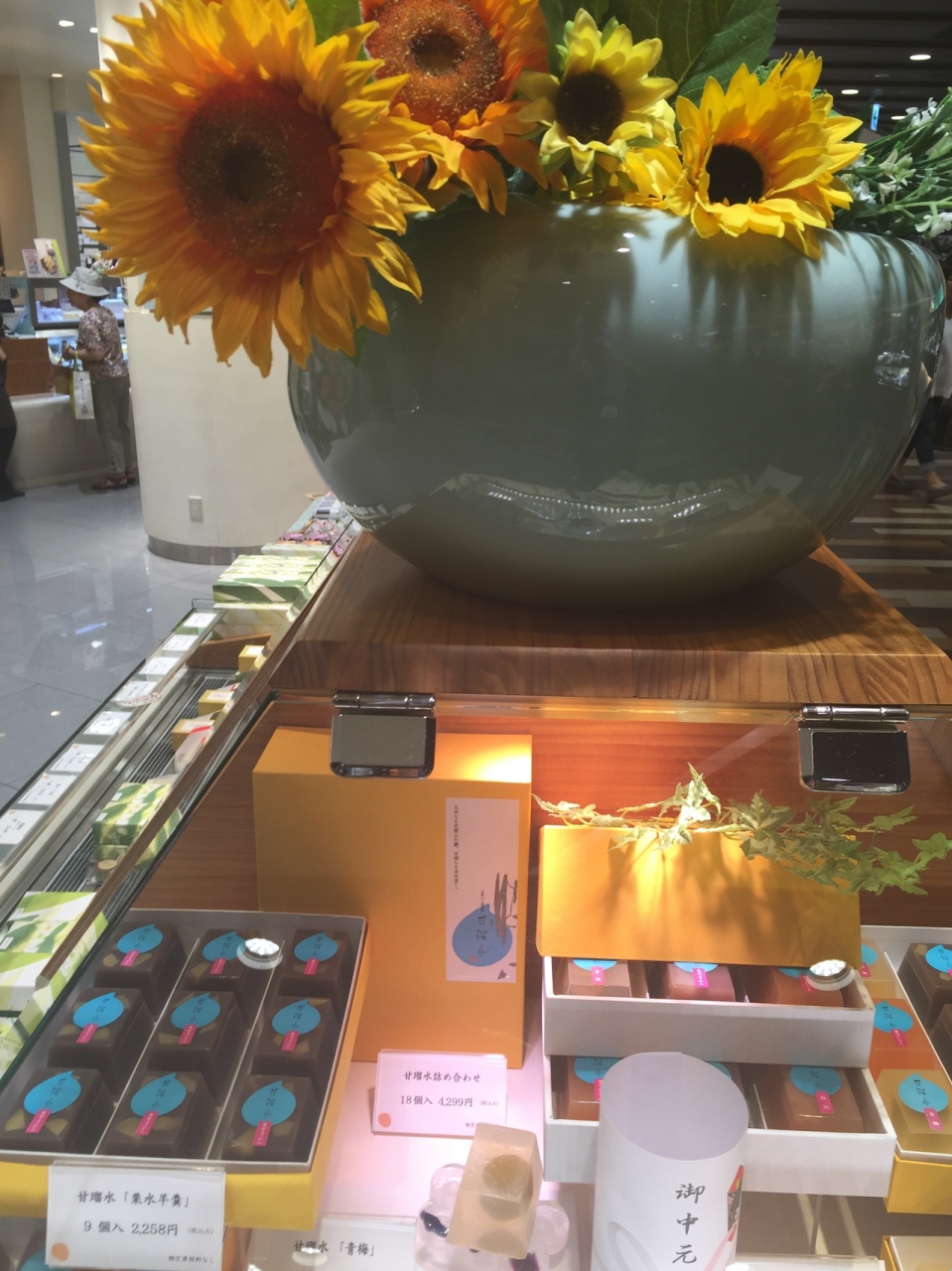 夏のお中元用のお菓子を探しに行ってきました。ディスプレイには、夏を感じさせる装飾と涼しげな水羊羹がおいしそうにありましたので、すぐにこれに決定!夏はやはり水菓子が喜ばれますよね~。